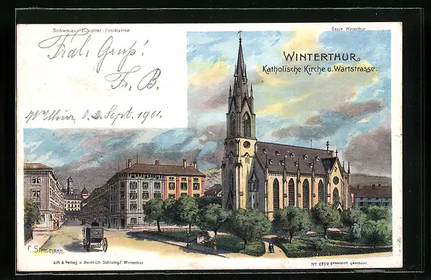 Lithographie Winterthur, Katholische Kirche und Wartstrasse, um 1900
