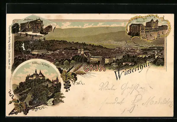 Lithographie Winterthur, Teilansicht, Schloss Kyburg, Bahnhof