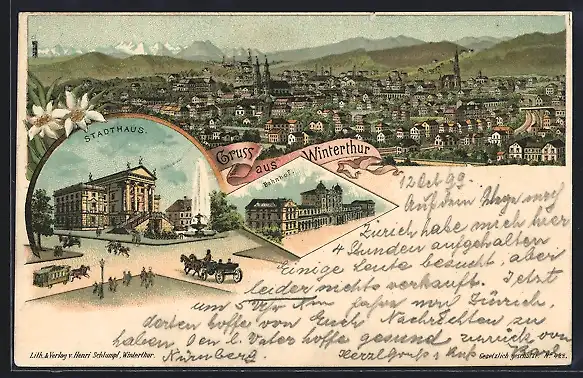 Lithographie Winterthur, Teilansicht, Stadthaus, Bahnhof