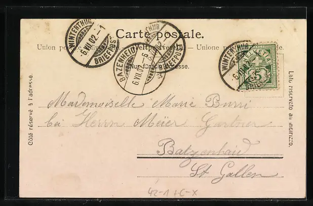 Personenbezogene Daten auf der Rückseite der Karte wurden durch blauen Textmarker unkenntlich gemacht. Die blauen Stellen sind auf die Vorderseite durchgeweicht und wirken sich negativ auf das Postkartenfoto aus