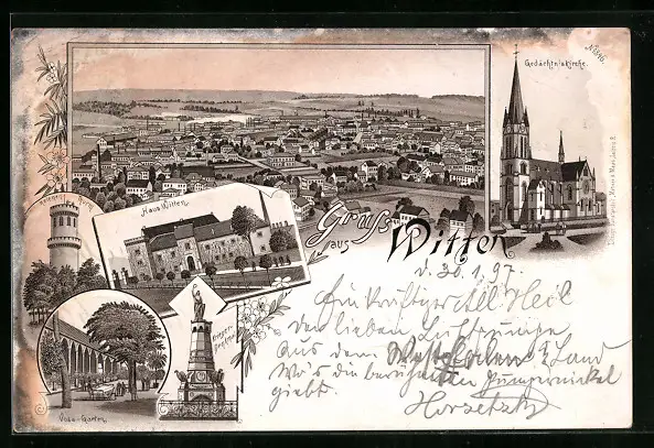 Lithographie Witten, Gedächtniskirche, Voss-Garten, Helenen-Thurm