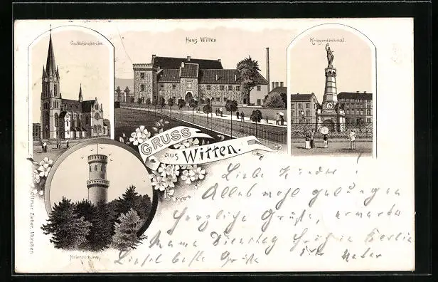 Lithographie Witten, Haus Witten, Helenenturm, Kriegerdenkmal