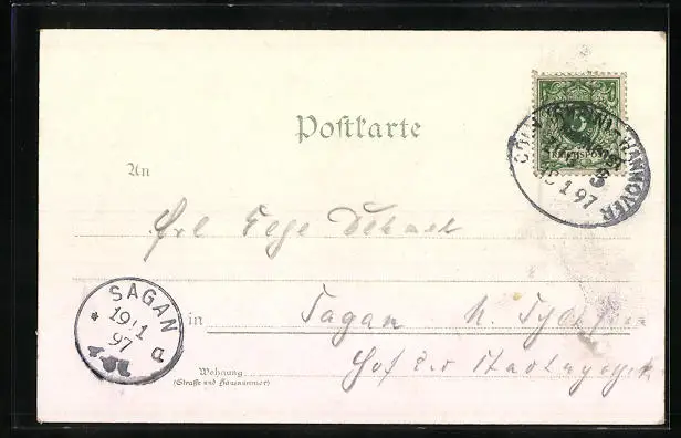 Personenbezogene Daten auf der Rückseite der Karte wurden durch blauen Textmarker unkenntlich gemacht. Die blauen Stellen sind auf die Vorderseite durchgeweicht und wirken sich negativ auf das Postkartenfoto aus