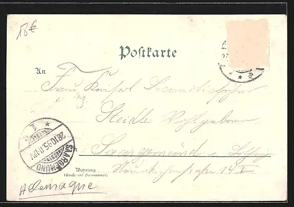 gelaufen 1895, Briefmarke entfernt, rückseitig Oberflächenschaden, Stempelspur, guter Zustand