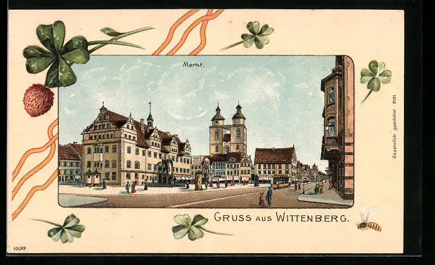 Lithographie Wittenberg, Partie am Markt mit Strassenbahn, Glücksklee