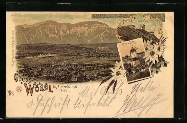 Lithographie Wörgl im Unterinntal, Teilansicht, Hohe Salve, Maria Stein