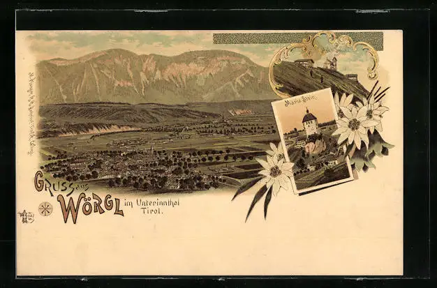 Lithographie Wörgl im Unterinntal, Teilansicht, Maria Stein, Hohe Salve