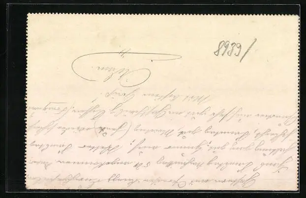 Personenbezogene Daten auf der Rückseite der Karte wurden durch blauen Textmarker unkenntlich gemacht. Die blauen Stellen sind auf die Vorderseite durchgeweicht und wirken sich negativ auf das Postkartenfoto aus
