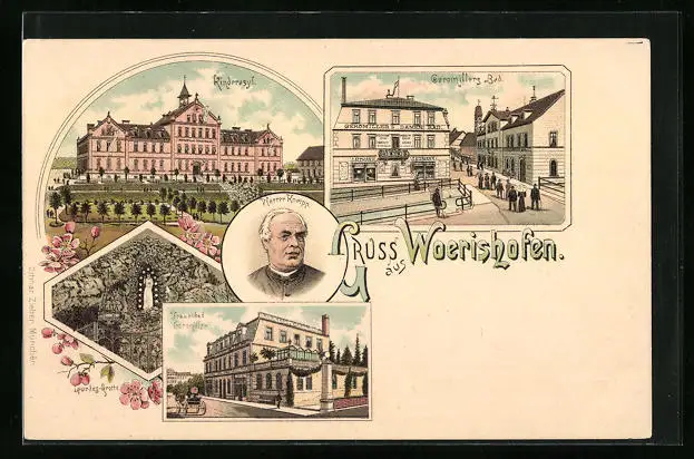 Lithographie Wörishofen, Geromillers Bad, Kinderasyl, Pfarrer Kneipp