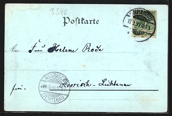 Personenbezogene Daten auf der Rückseite der Karte wurden durch blauen Textmarker unkenntlich gemacht. Die blauen Stellen sind auf die Vorderseite durchgeweicht und wirken sich negativ auf das Postkartenfoto aus