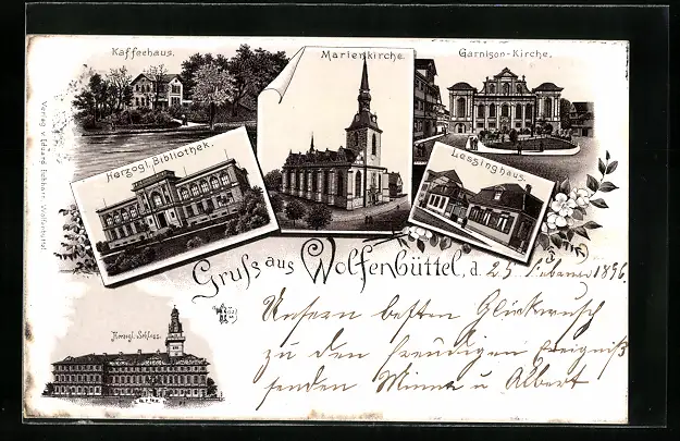 Lithographie Wolfenbüttel, Ortsansicht mit Kaffeehaus, Garnison-Kirche, Lessinghaus & Bibliothek
