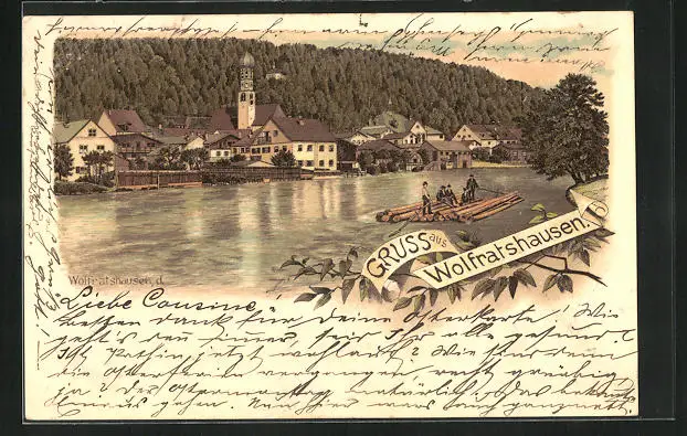 Lithographie Wolfratshausen, Uferpartie mit Floss