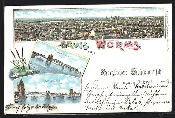 Lithographie Worms, Eisenbahnbrücke, Strassenbrücke, Totalansicht