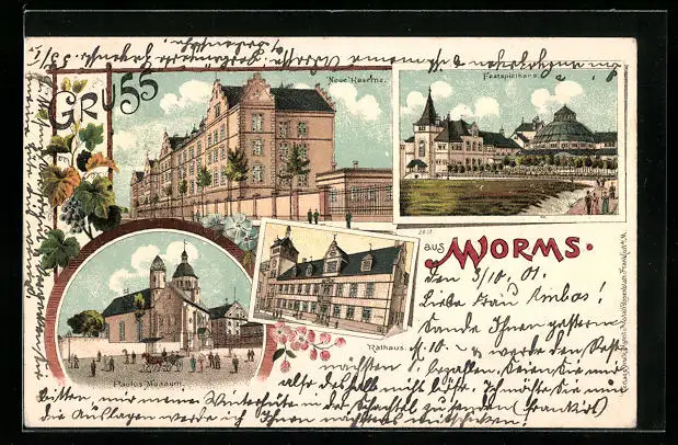 Lithographie Worms, Neue Kaserne, Paulus Museum, Festspielhaus