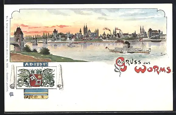 Lithographie Worms, Stadtpanorama mit Brücke u. Dampfer, Wappen, 1899