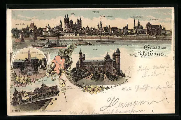 Lithographie Worms, Totalansicht, Dom, Festspielhaus