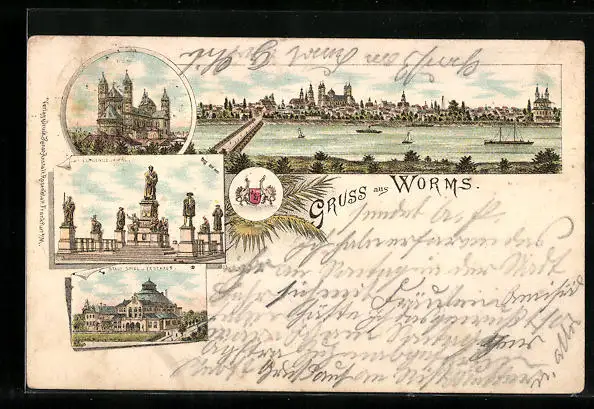 Lithographie Worms, Totalansicht, Dom, Lutherdenkmal