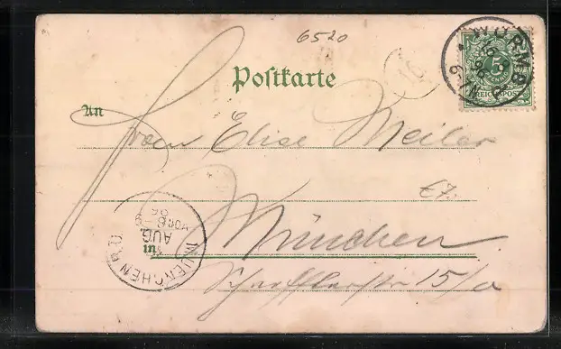 Personenbezogene Daten auf der Rückseite der Karte wurden durch blauen Textmarker unkenntlich gemacht. Die blauen Stellen sind auf die Vorderseite durchgeweicht und wirken sich negativ auf das Postkartenfoto aus