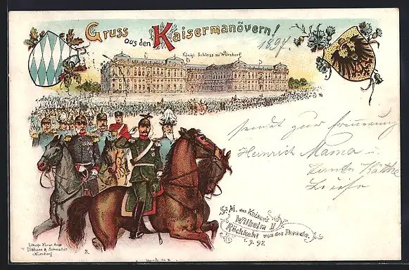 Lithographie Würzburg, Kaisermanöver vor Kgl. Schloss