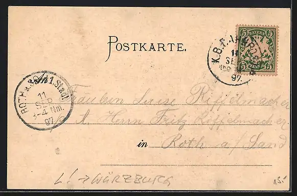 Personenbezogene Daten auf der Rückseite der Karte wurden durch blauen Textmarker unkenntlich gemacht. Die blauen Stellen sind auf die Vorderseite durchgeweicht und wirken sich negativ auf das Postkartenfoto aus