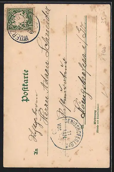 Personenbezogene Daten auf der Rückseite der Karte wurden durch blauen Textmarker unkenntlich gemacht. Die blauen Stellen sind auf die Vorderseite durchgeweicht und wirken sich negativ auf das Postkartenfoto aus