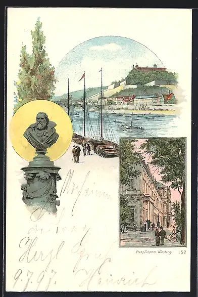 Lithographie Würzburg, Ortsansicht, Strassenpartie, Denkmal