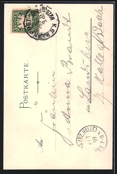 Personenbezogene Daten auf der Rückseite der Karte wurden durch blauen Textmarker unkenntlich gemacht. Die blauen Stellen sind auf die Vorderseite durchgeweicht und wirken sich negativ auf das Postkartenfoto aus