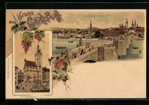Lithographie Würzburg, Teilansicht, Alte Brücke und Stadt, Graf Eckhardtthurm