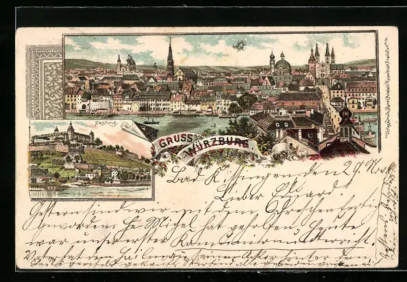 Lithographie Würzburg, Teilansicht mit Kirche, Festung
