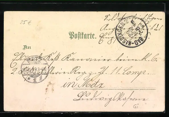 Personenbezogene Daten auf der Rückseite der Karte wurden durch blauen Textmarker unkenntlich gemacht. Die blauen Stellen sind auf die Vorderseite durchgeweicht und wirken sich negativ auf das Postkartenfoto aus