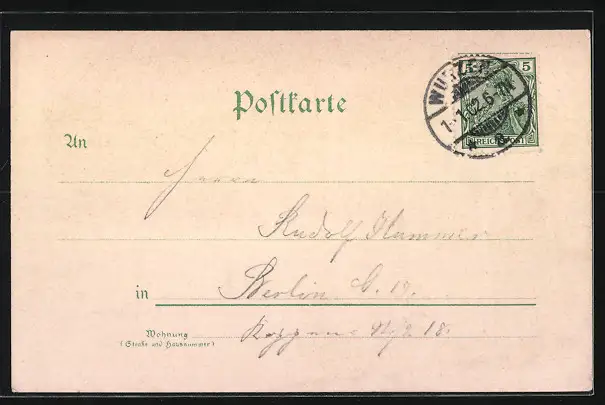 Personenbezogene Daten auf der Rückseite der Karte wurden durch blauen Textmarker unkenntlich gemacht. Die blauen Stellen sind auf die Vorderseite durchgeweicht und wirken sich negativ auf das Postkartenfoto aus