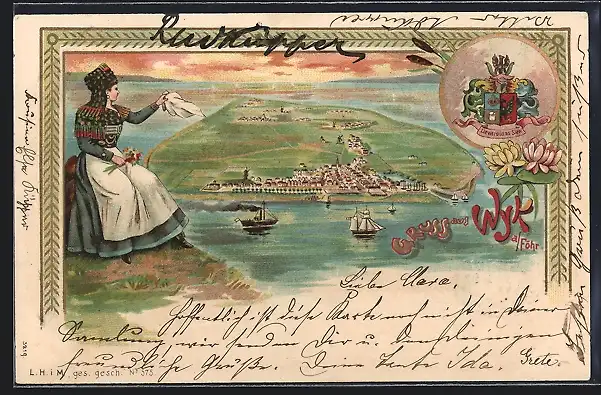Lithographie Wyk a. Föhr, Teilansicht und winkende Frau, Wappen