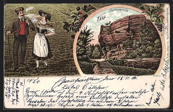 Lithographie Zabern, Wanderer beim Karlssprung, Elsässer Paar in Tracht