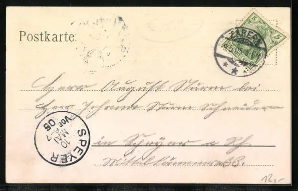 Personenbezogene Daten auf der Rückseite der Karte wurden durch blauen Textmarker unkenntlich gemacht. Die blauen Stellen sind auf die Vorderseite durchgeweicht und wirken sich negativ auf das Postkartenfoto aus