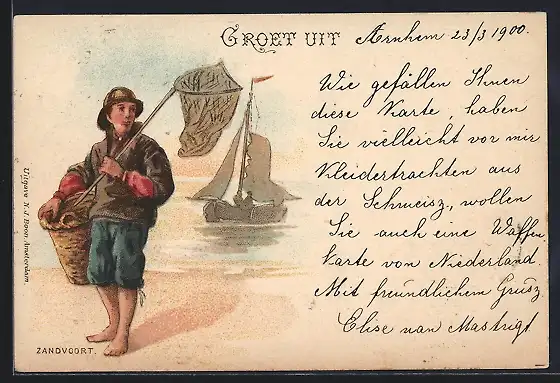 Lithographie Zandvoort, Fischer mit Korb und Kescher am Strand