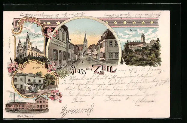Lithographie Zeil, Bahnhof, Rentamt, Mech. Weberei