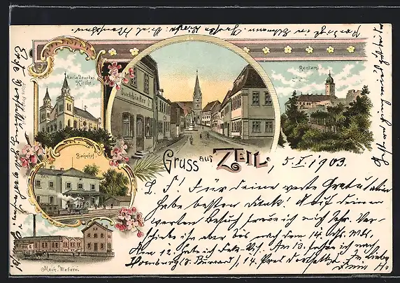 Lithographie Zeil, Bahnhof, Rentamt, Mech. Weberei