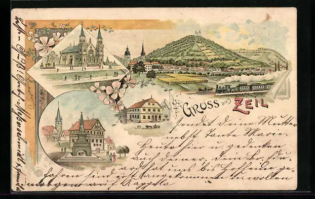 Lithographie Zeil, Gasthaus, Kirche, Denkmal