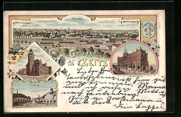 Lithographie Zeitz, Altmarkt, Stadtschule, Post