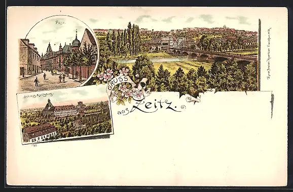 Lithographie Zeitz, Post, Schloss Moritzburg, Totalansicht