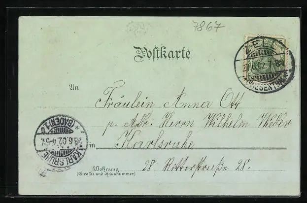 Personenbezogene Daten auf der Rückseite der Karte wurden durch blauen Textmarker unkenntlich gemacht. Die blauen Stellen sind auf die Vorderseite durchgeweicht und wirken sich negativ auf das Postkartenfoto aus