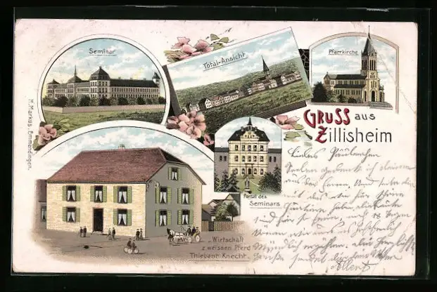 Lithographie Zillisheim, Gasthaus z. weissen Pferd, Seminar, Totalansicht
