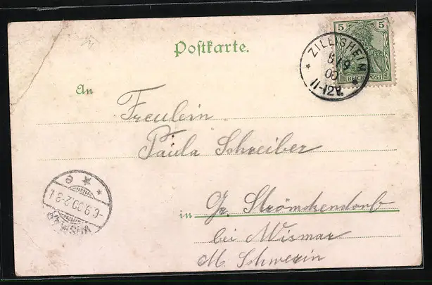 Personenbezogene Daten auf der Rückseite der Karte wurden durch blauen Textmarker unkenntlich gemacht. Die blauen Stellen sind auf die Vorderseite durchgeweicht und wirken sich negativ auf das Postkartenfoto aus