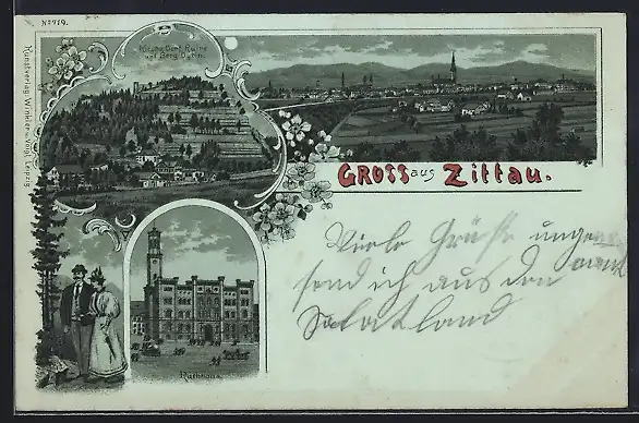 Lithographie Zittau, Rathaus, Teilansicht, Pärchen