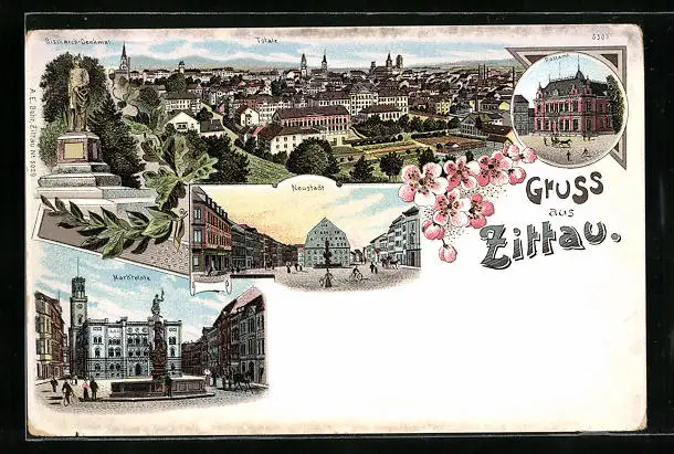Lithographie Zittau, Totalansicht mit Marktplatz