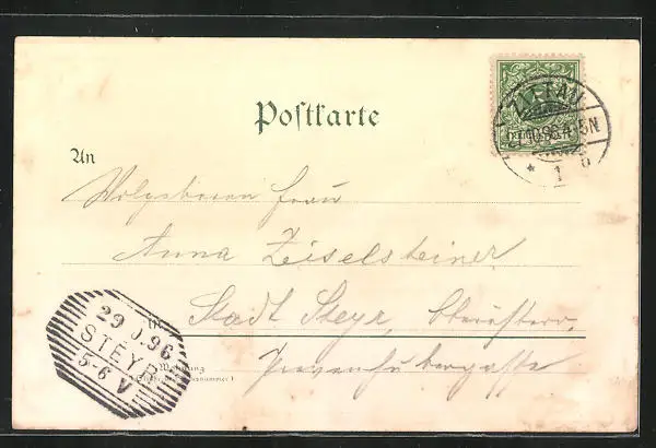 Personenbezogene Daten auf der Rückseite der Karte wurden durch blauen Textmarker unkenntlich gemacht. Die blauen Stellen sind auf die Vorderseite durchgeweicht und wirken sich negativ auf das Postkartenfoto aus