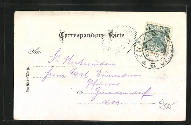 Personenbezogene Daten auf der Rückseite der Karte wurden durch blauen Textmarker unkenntlich gemacht. Die blauen Stellen sind auf die Vorderseite durchgeweicht und wirken sich negativ auf das Postkartenfoto aus