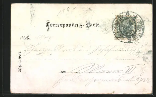Personenbezogene Daten auf der Rückseite der Karte wurden durch blauen Textmarker unkenntlich gemacht. Die blauen Stellen sind auf die Vorderseite durchgeweicht und wirken sich negativ auf das Postkartenfoto aus