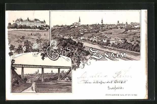 Lithographie Znaim, Totalansicht, Thaya Viaduct