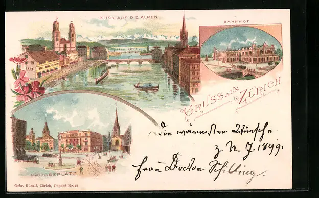 Lithographie Zürich, Blick auf die Alpen, Bahnhof, Paradeplatz